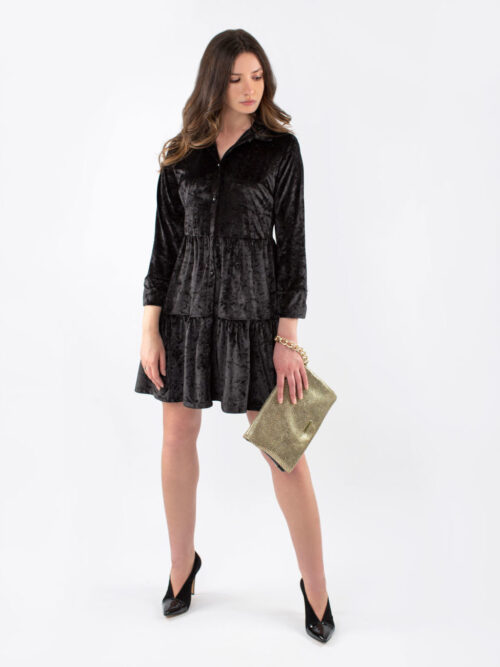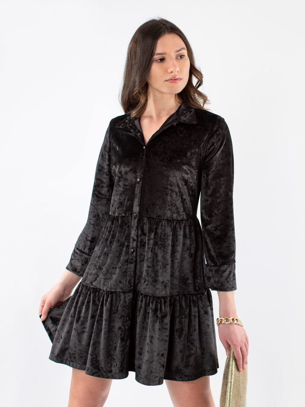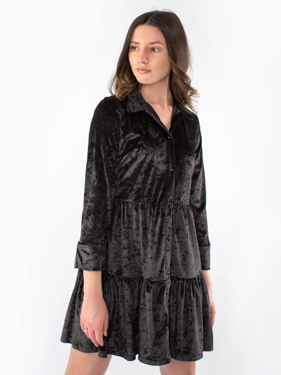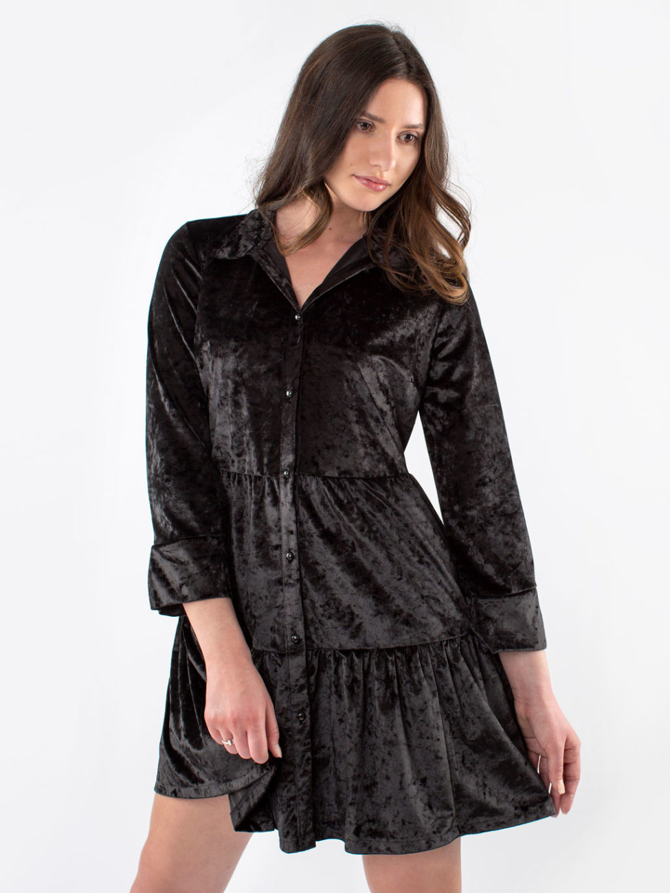 Krásne zamatové šaty v čiernej farbe. Šaty sú vyrobené z príjemného materiálu a na pohodlnosti im dodáva aj voľnejší strih, ktorý je veľmi trendy. Šaty majú dlhý rukáv a zapínajú sa po celej dĺžke na gombíky. Tento kúsok je vyrobený z kvalitného materiálu a určite si ho zamiluješ.