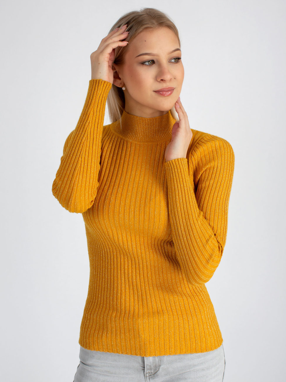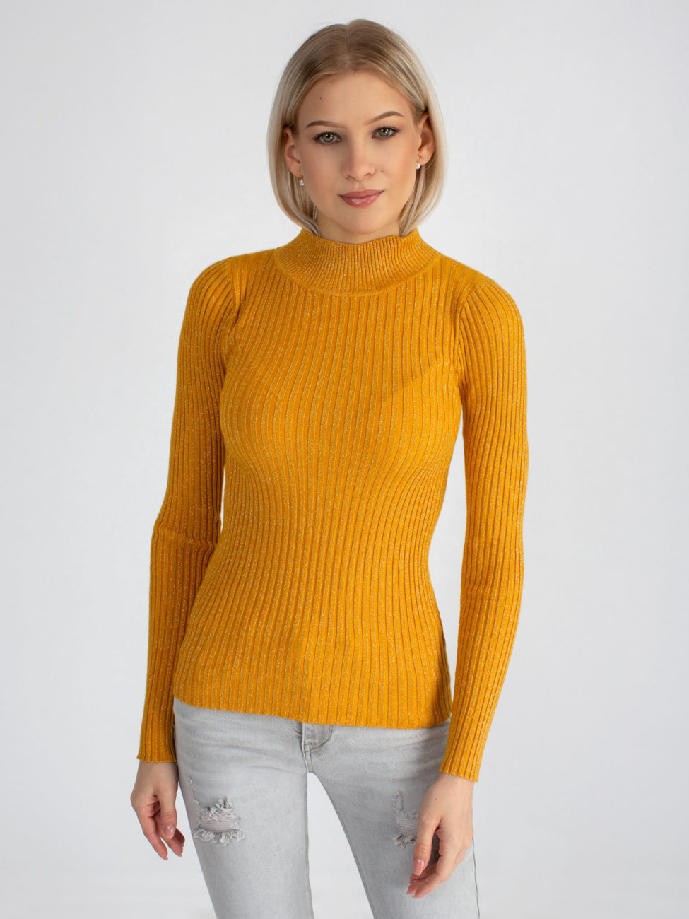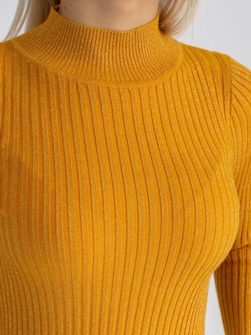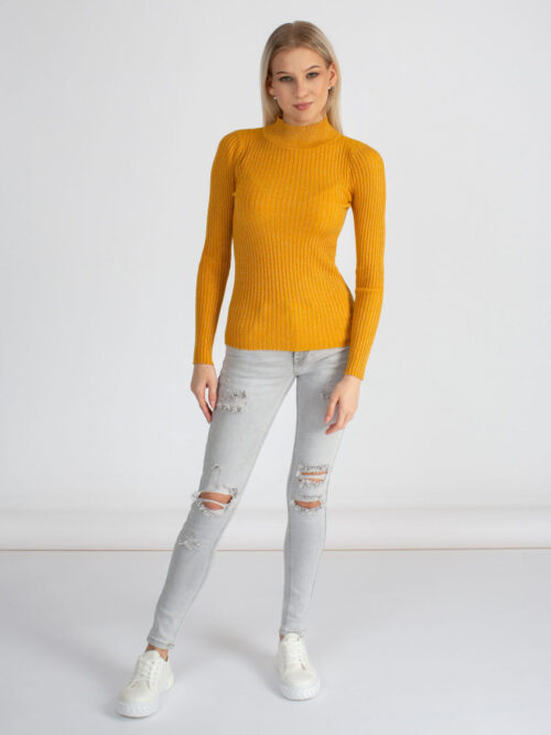Dámsky tenší svetrík v trendy žltej farbe. Svetrík je priliehavý, vyrobený z vrúbkovaného elastického úpletu s lurexom. Má dlhý rukáv a polorolák. Pohodlný kúsok, v ktorom určite zažiariš!